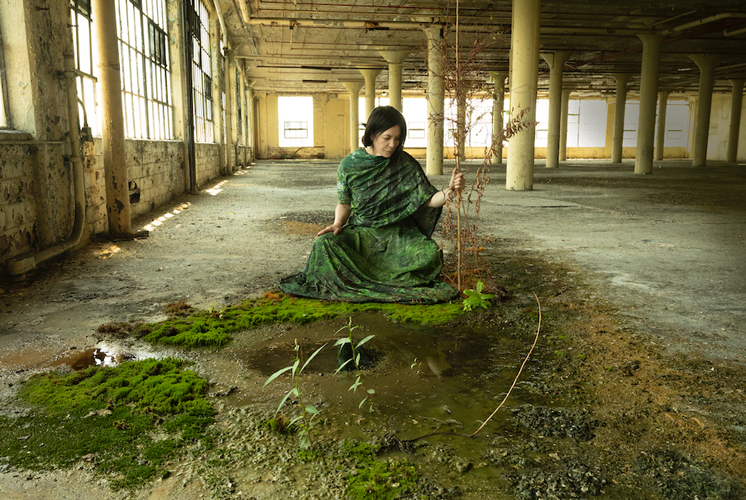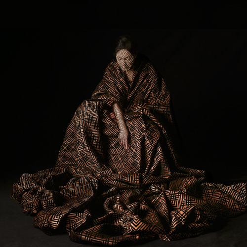 La construcción de mantos textiles con claras referencias a los tejidos de los antiguos pueblos andinos, especialmente del Perú, ha sido un proceso personal que remite a la pérdida y a la reparación; en su hacer artesanal, desarrolla una aproximación singular a este importante legado, explorando aspectos estructurales del tejido y del uso de materiales encontrados. Finalmente, para sus performances registrados en fotografia, la artista se vale de su cuerpo como soporte recurrente donde, a partir de diversos procesos, se mimetiza con el entorno natural, mutando en identidades zoomórficas, en paraisos florales o en la reinterpretacion de rituales femeninos atemporales.