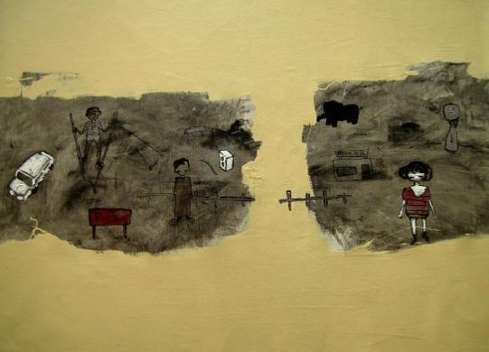 La tela y pedazos de madera encontrados se tornan en alianza pictórica para acompañarlo en esta sensible aventura. El Callejón K-S se abre para nuevos y significativos encuentros.”