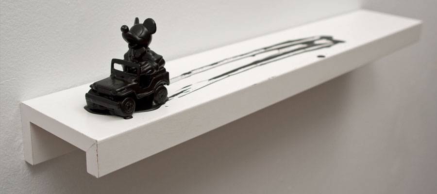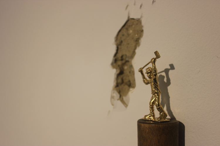 En Untitled with traveller, 2011, la diminuta figura del viajero transportando su equipaje deja atrás el camino que lleva a una estructura que alguna vez fue habitada y que ha colapsado, reteniendo entre capas y estratos superpuestos las memorias allí contenidas. La acción del desplazamiento y la sutileza del trazo recorrido nos relatan probablemente historias de pérdidas y abandonos. Por el contrario, en To Paint White, 2012, descubrimos la figura del obrero que va pintando desde su mínima perspectiva la ambiciosa estructura en una acción de recuperación heroica de los espacios (re)conquistados para habitar. Argumentos universales que alcanzan a pulsar los asuntos locales y específicos de diferentes contextos. Revolution, 2016, quizás una de la piezas más directas por su referencia lingüística y simbólica, encuentra asidero en las primeras letras de madera negra y corpórea que emergen del muro para, de inmediato, apocarse en un manuscrito de frágil trazo, apuntando posiblemente a la precipitación y disolución del discurso. Asimismo, El Suicida III, 2015 representa a un hombrecito anclado desafiante sobre el borde de la cabeza de un martillo intervenido, en una actitud que pone en duda o en suspenso sus aparentes o apócrifas determinaciones.