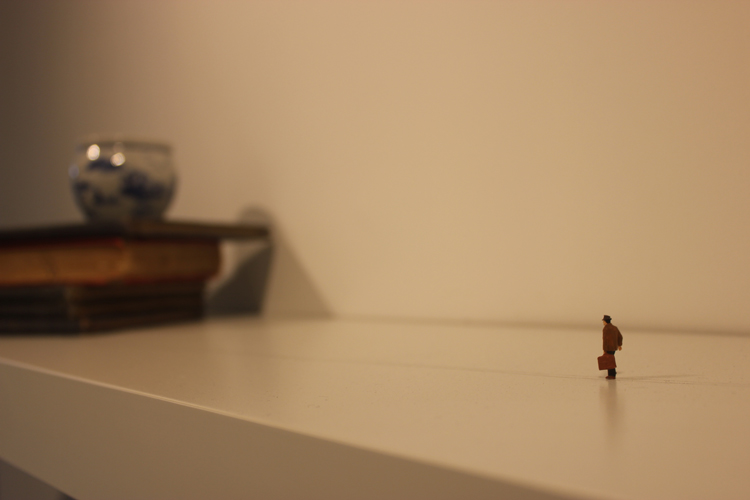 En esta, la serie más reciente, se manifiestan los distintos argumentos temáticos recurrentes en la trayectoria de Porter. La soledad del hombre frente a la realidad en To Hold the String y lo absurdo en la labor de The Gardener, ambas realizadas en 2015. Asimismo, en la serie de trabajos forzados la combinación de escalas establece la metáfora de lo diminuto frente a lo inmenso para registrar la compleja condición humana: la confrontación del individuo que asume una tarea que lo sobrepasa; el hombre que repara las fisuras del inmenso reloj; la tejedora que hila afanosamente hasta el infinito; los personajes que ejecutan acciones destructivas como Man with Pickaxe, 2015. Sin embargo, estas obras proyectan, para nuestro asombro, un pensamiento alentador, pues sus héroes persisten en sus faenas, tareas y ocupaciones y no sucumben en el intento. Finalmente, To Go Back (with books), 2015, alude al inminente paso del tiempo. En esta instalación, el minúsculo viajero cargado con su pequeña maleta, se dirige hacia la “casa” –ilustrada aquí sobre un jarrón chino– recorriendo el largo e interminable sendero trazado por un camino que atraviesa todos los obstáculos, –representados por un par de libros apilados– con la esperanza de llegar alguna vez a su destino. De nuevo, el sentido de relatividad nos señala la paradoja entre un mundo catastrófico y a la vez esperanzador. Aquí se evidencia una conexión más real con el objeto. La escala es determinante, lo pequeño “manifiesta lo infinito del “lugar” y “lo solo” de cualquier entidad o persona” (5). Cuando el objeto aparece solo en un escenario vacío sin contexto espacio-temporal se enfatiza la verdadera condición del sujeto, se torna esencial y se aleja definitivamente del prejuicio arquetipal de narrativas preexistentes.