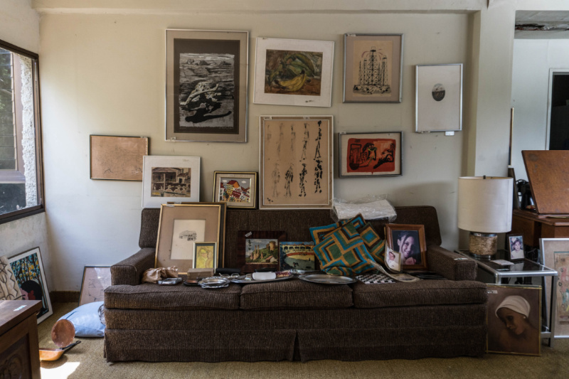 "Paredes desconchadas, mansiones invadidas por la naturaleza circundante, libros y publicaciones abatidos en el piso, cuadros descolgados, fotografías abandonadas, cajas de cartón y papel de embalaje, acompañan esta historia de transitoriedad desplazamiento y resiliencia", según escribe la curadora Ruth Auerbach, en el texto que acompaña la exposición.