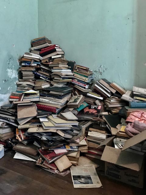 Paredes desconchadas, mansiones invadidas por la naturaleza circundante, libros y publicaciones abatidos en el piso, cuadros descolgados, fotografías abandonadas, cajas de carton y papel de embalaje acompañan esta historia de transitoriedad desplazamiento y resiliencia.