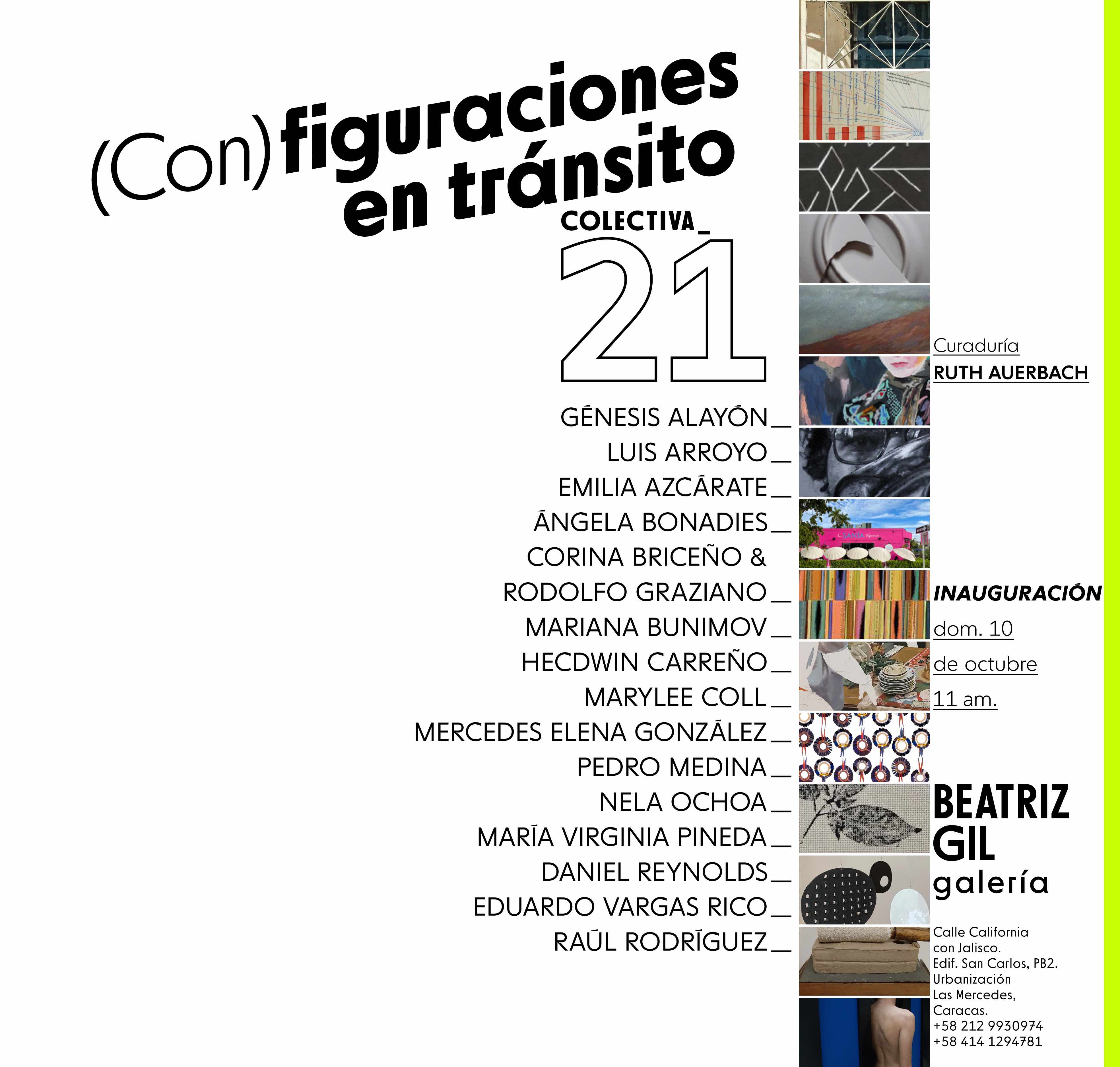 (Con)figuraciones en tránsito se presenta como un espacio plural de intercambio, a partir de las propuestas de 16 creadores venezolanos de generaciones intermedias y de jóvenes emergentes que provienen de diferentes ciudades del país y de capitales trasatlánticas. En torno a esta muestra colectiva de carácter anual, cada cuerpo de trabajo aporta las claves de una representación híbrida de narrativas locales y códigos culturales que, a partir de la presentación y circulación de las imágenes, trazan una perspectiva de la producción artística reciente.