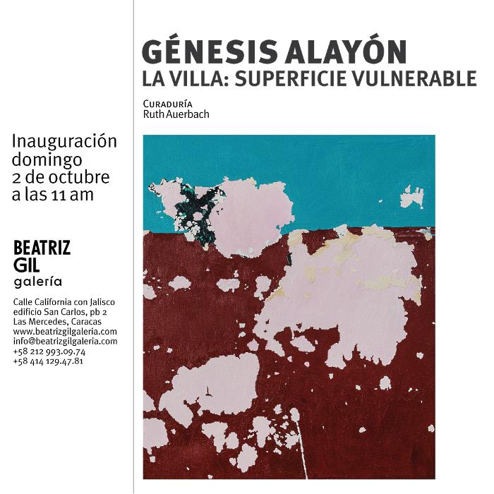 La propuesta pictórica de Génesis Alayón se corresponde así con los lenguajes de una generación de jóvenes creadores que operan en los intersticios de tópicos comunes a sus preocupaciones: migración, nomadismo y desarraigo; cambios constantes del entorno y transformación de los espacios habitables; y con ello, un itinerario de cartografías subjetivas producidas a partir de un ejercicio procesual de trayectorias cruzadas.