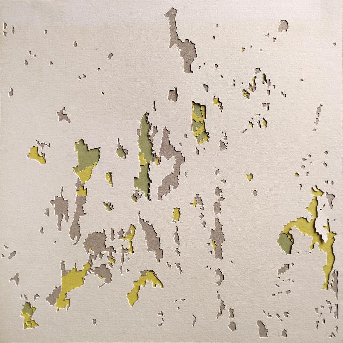 La Villa: superficie vulnerable exhibe la travesía visual de la artista. En la serie de Ventanas se recrea una detallada topografía de estructuras y celosías que distinguen las viviendas del entorno natural. Las Paredes delatan los despojos de muros ruinosos -suerte de palimpsesto- que conservan las huellas del pasado; y, en el conjunto de Muestras se superponen, en tamaño real, tantos recortes de papel como capas de pintura han trascendido al tiempo. Con esta estrategia, que enlaza el fragmento pictórico con su relieve, continua la búsqueda de la espacialidad en un intento por desafiar lo ilustrativo en su narrativa.1 La noción de fragilidad se profundiza aun más en el grupo de Protectores, telas incisas y desplazadas del marco, en las cuales la aparente funcionabilidad preventiva de estos “guardianes del refugio”, queda paradójicamente disminuida. Al descubrir la belleza en lo intrascendente, la representación naturalista de la ruina pareciera entonces transmutar en una imagen incierta y desintegrada, registrando los argumentos de una metáfora de la precariedad y el deterioro.