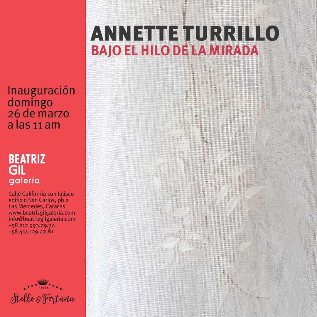 Annette Turrillo es una artista venezolana que hace vida en Europa desde mediados de la década de los noventa. Arquitecta de profesión y estudiante del Instituto de Arte Federico Brandt, continuará sus estudios de artes visuales en la Universidad de París VIII, especializándose en las técnicas de grabado, dibujo y serigrafía. Desde el año 2016 no exponía en Venezuela. Su obra reciente contempla un traslado a nivel de técnicas y materiales que, aunque la distancia de un trabajo bidimensional que por mucho tiempo desarrolló con la pintura, consolida las directrices de su investigación en torno a problemáticas de lo humano que siempre la han ocupado. Desde un panorama diverso, presenta el apego por la memoria y el desvanecimiento, por los linderos de lo que somos y de lo que hemos perdido privada o colectivamente, dibujando una mirada sutil que va hacia la evanescencia y lo sugerido, para trazar lumínicos espacios donde resaltan tramas traslúcidas de múltiples contenidos. Bajo el hilo de la mirada es para ella la delicada forma como tejemos o des-tejemos roles, abusos de poder, engranajes del tiempo y del espacio. Cambiar esa perspectiva o esa forma de mirar, es un punto muy importante en la producción de Annette, y tiene que ver con re-educar la mirada a través de ese hilo que ella bien maneja, el que nos ciega o nos descubre, el que denuncia, el que nos silencia o el que nos abre paso.
