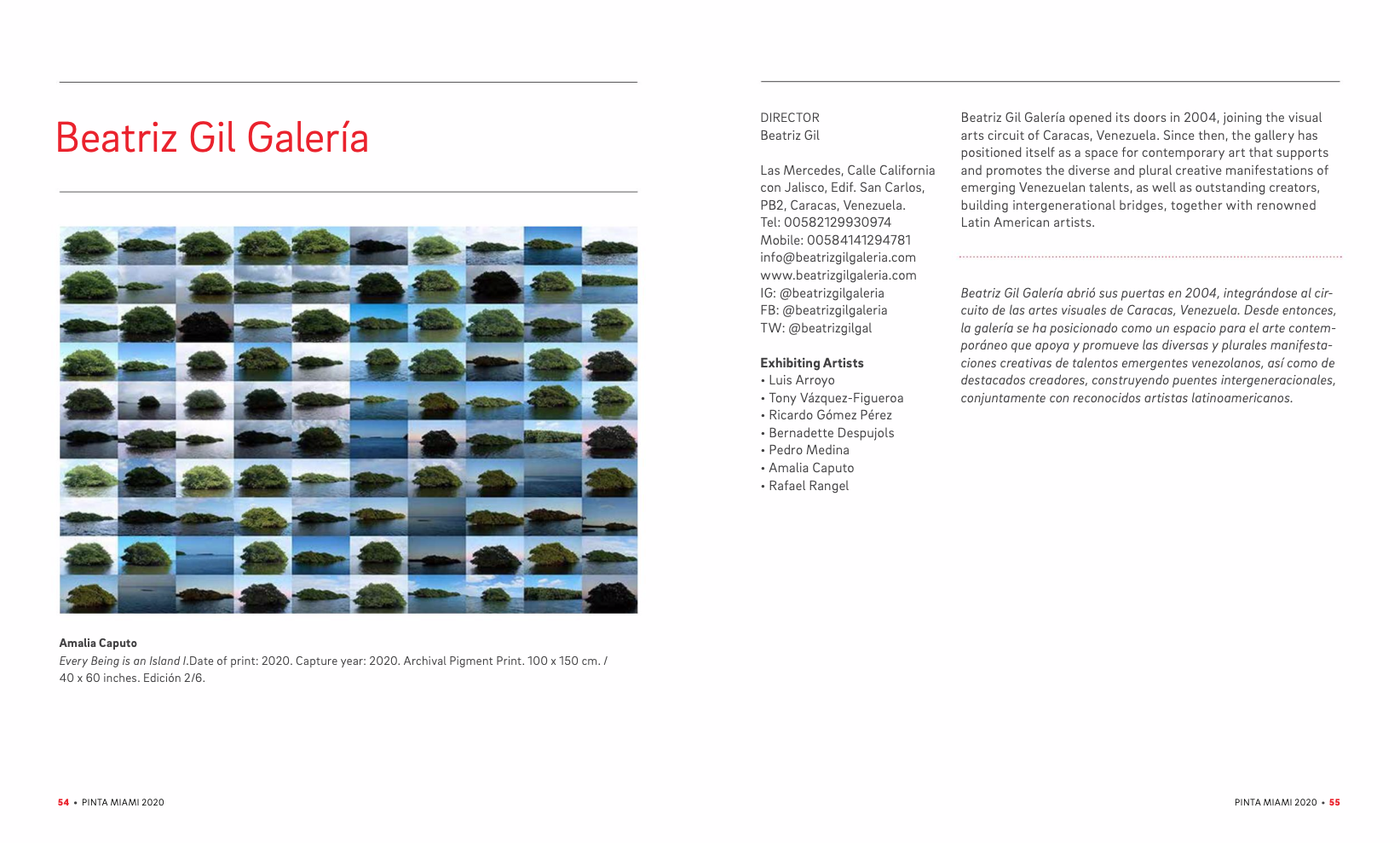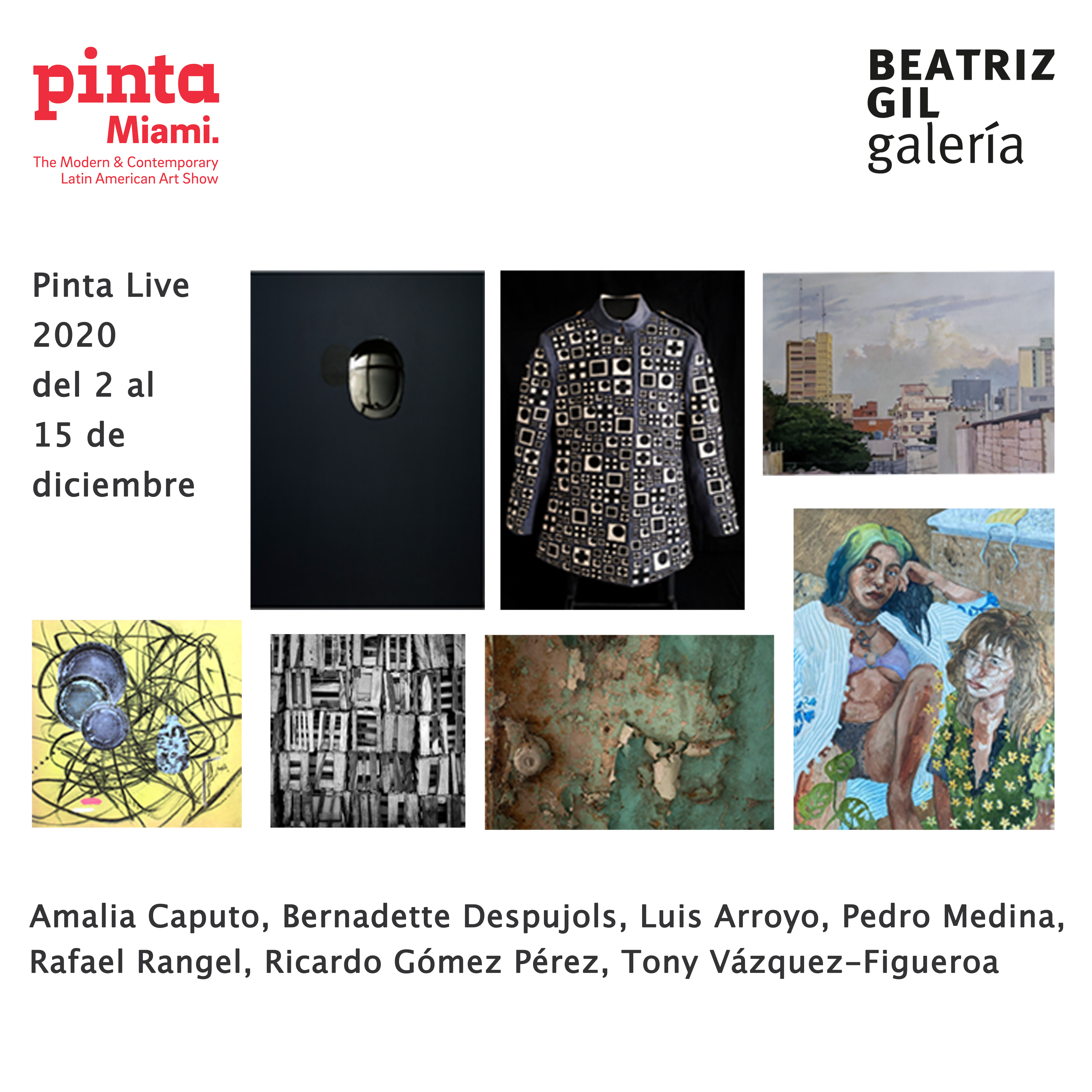 En esta oportunidad, Beatriz Gil galería participa en Pinta Contemporánea con la presentación de siete destacados artistas venezolanos, cuyos procesos creativos se valen de la práctica fotográfica, pintura, escultuta y textiles como medios de expresión, mediados por una diversidad de argumentos discursivos y a la vez críticos de su entorno: Amalia Caputo, Bernadette Despujols, Luis Arroyo, Pedro Medina, Rafael Rangel, Ricardo Gómez Pérez y Tony Vázquez- Figueroa, integran la muestra, en una propuesta expositiva, bajo el concepto curatorial de Beatriz Gil.